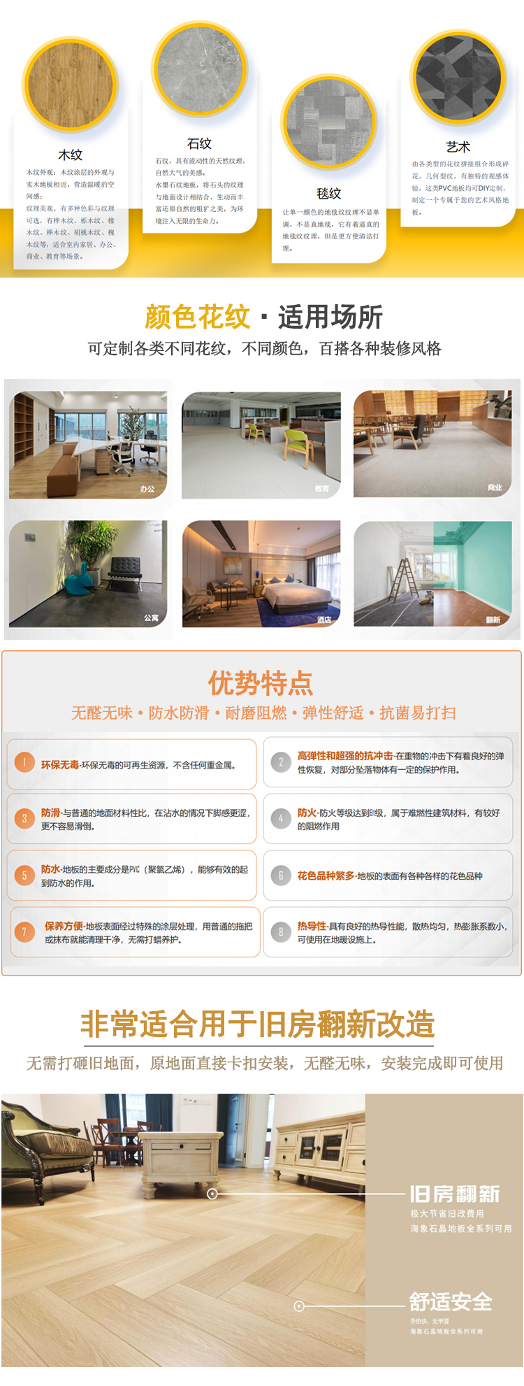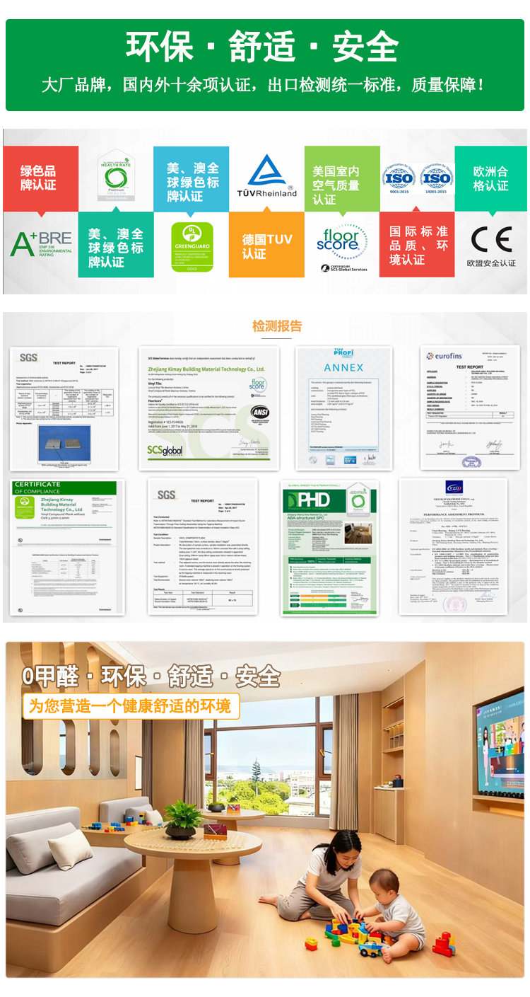 介紹:出口級WPC石晶地板8mm,無甲醛,無味,防水,防滑,適用于家裝、學校、幼兒園、酒店、民宿等老舊地面改造。